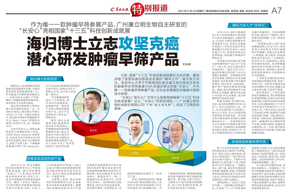 引言:日前,“長安心”產(chǎn)品在“十三五”科技創(chuàng)新成就展亮相,吸引了各界的關(guān)注。康立明生物創(chuàng)始人、腸癌早篩技術(shù)發(fā)明人鄒鴻志博士及科學(xué)家團(tuán)隊(duì)接受媒體記者采訪,暢談科技報國、潛心研發(fā)腫瘤早篩產(chǎn)品的心路歷程。