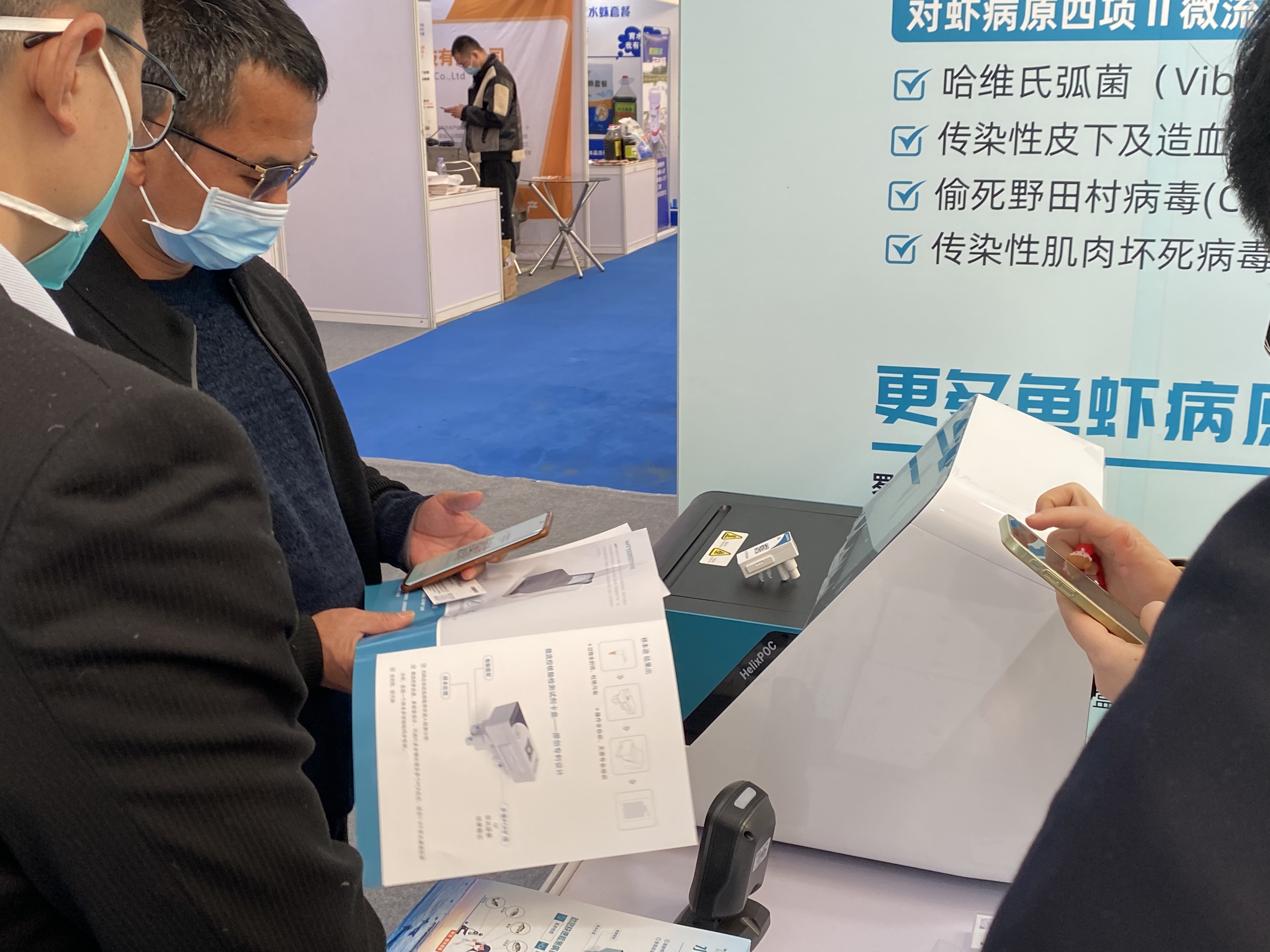 本次展會,康立明生物全資子公司好芝生物攜帶HelixPOC®全自動微流控?zé)晒?/span>PCR一體機及HelixPOC®水產(chǎn)病原微流控核酸檢測試劑盒赴展。