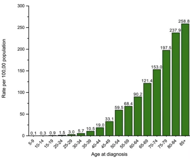 下圖是美國2012-2016年各年齡段腸癌發(fā)病率數(shù)據(jù),數(shù)據(jù)顯示,55歲以上,每增加5歲,發(fā)病率大約增加30%。
