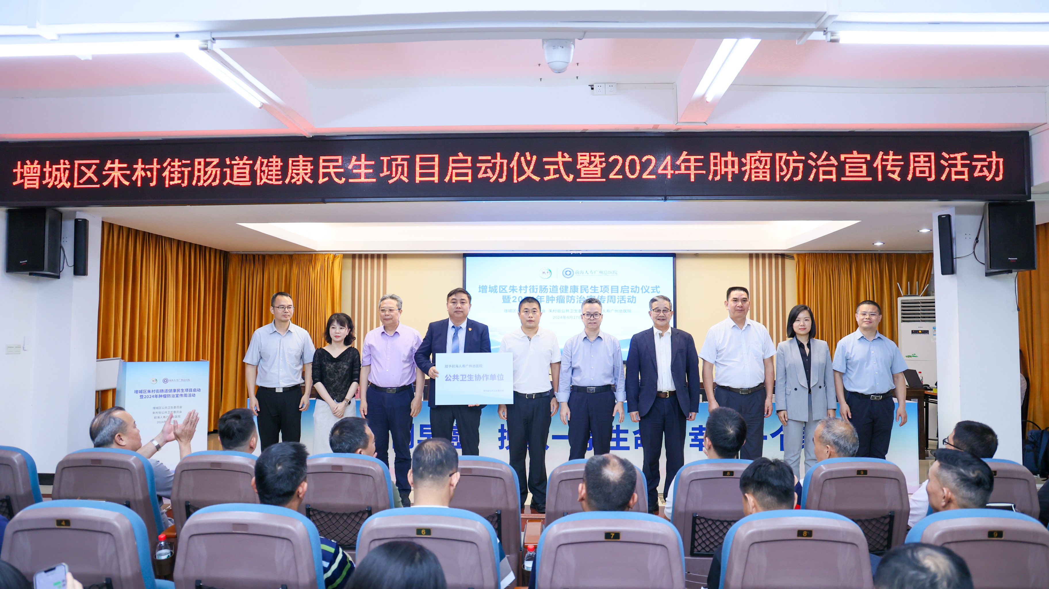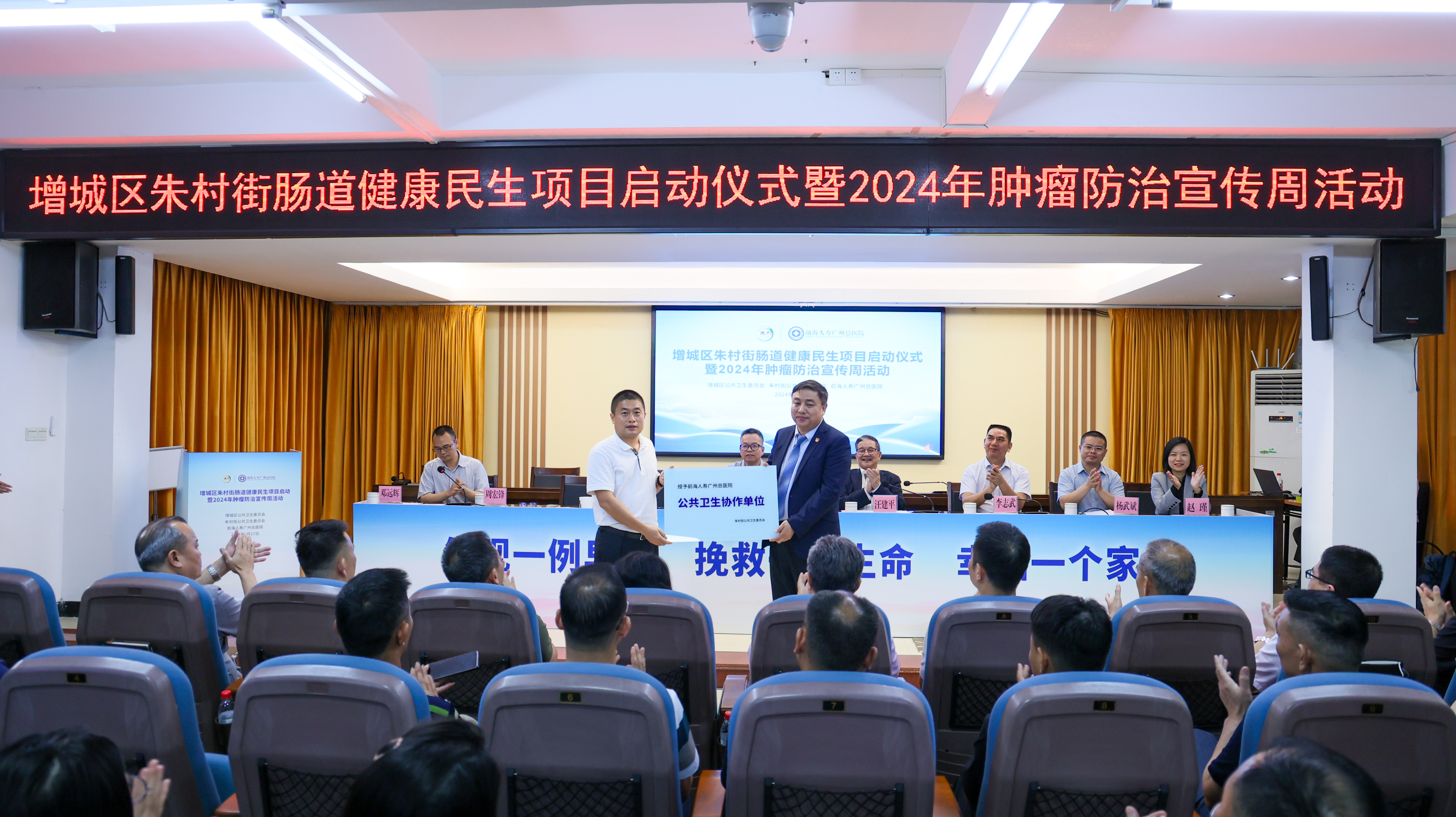 增城區(qū)朱村街黨工委書記潘國代表朱村街向前海人壽廣州總醫(yī)院授予“公共衛(wèi)生協(xié)作單位”牌匾。這標(biāo)志著增城區(qū)朱村街“腸道健康民生項(xiàng)目”正式啟動(dòng)。