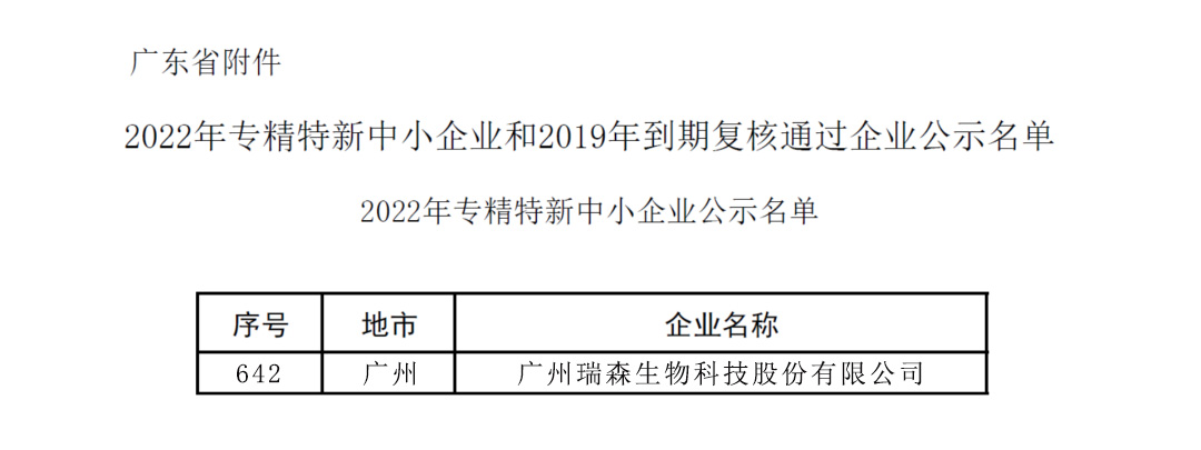 經(jīng)過(guò)層層審核,廣東省工業(yè)和信息化廳于2023年1月6日發(fā)布了關(guān)于2022年專精特新中小企業(yè)和2019年到期復(fù)核通過(guò)企業(yè)名單的公示,廣州瑞森生物科技股份有限公司憑借在食品安全快速檢測(cè)領(lǐng)域不斷的科技創(chuàng)新和良好的社會(huì)效應(yīng),通過(guò)了專業(yè)化、精細(xì)化、特色化、創(chuàng)新能力等四類指標(biāo)評(píng)價(jià),獲得廣東省專精特新中小企業(yè)認(rèn)定。標(biāo)志著瑞森生物的科技創(chuàng)新與研發(fā)實(shí)力又更上了一個(gè)新的臺(tái)階,至此表示熱烈祝賀。 瑞森生物此次獲得“專精特新”評(píng)價(jià)與認(rèn)定,體現(xiàn)了廣東省工業(yè)和信息化廳等機(jī)構(gòu)對(duì)我司的高度認(rèn)可,我司將以“專精特新”為發(fā)展道路上一個(gè)里程碑,踔厲奮發(fā)、勇毅前行,創(chuàng)建輝煌,奉獻(xiàn)社會(huì)。
