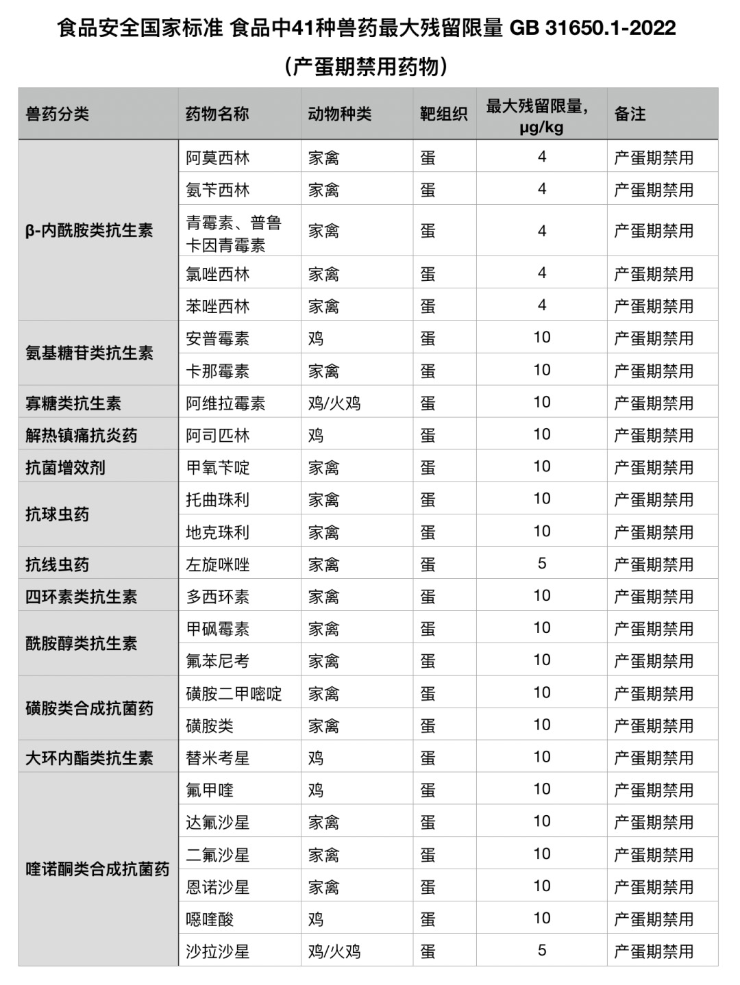 關(guān)于靶組織為“蛋”的標(biāo)準(zhǔn)共29項(xiàng),補(bǔ)充產(chǎn)蛋期禁用藥物限量25項(xiàng),增加停用藥物限量4項(xiàng)。臨床上使用蛋雞產(chǎn)蛋期或乳畜泌乳期禁用的藥物,或在雞蛋、牛奶中檢出相關(guān)藥物的殘留,屬于養(yǎng)殖環(huán)節(jié)超范圍、不規(guī)范用藥范疇。