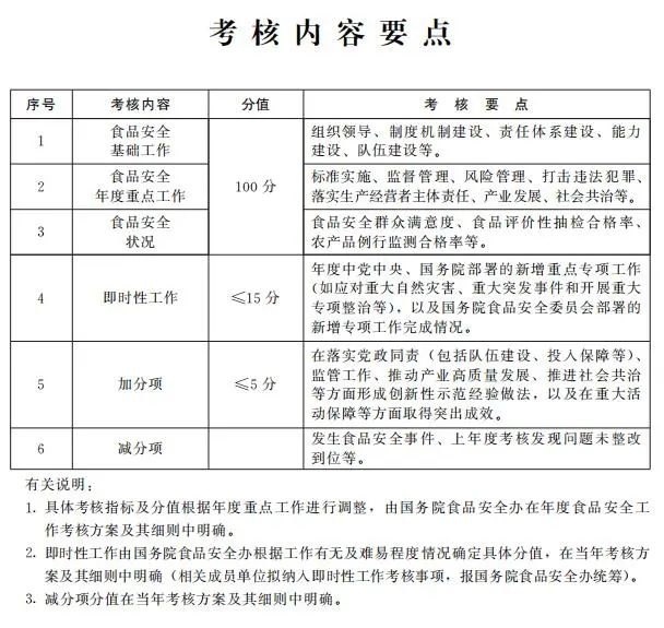 第五條 考核內(nèi)容主要包括食品安全基礎(chǔ)工作推進、年度重點工作落實、食品安全狀況等,同時設(shè)置即時性工作評價和加減分項(考核內(nèi)容要點見附件)。具體考核指標(biāo)及分值在年度食品安全工作考核方案及其細則中明確,設(shè)置要科學(xué)合理,可操作、可評價、可區(qū)分,切實減輕基層負擔(dān)。