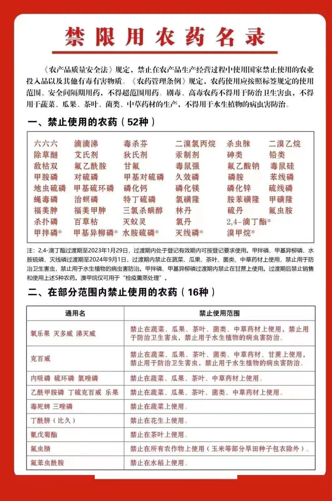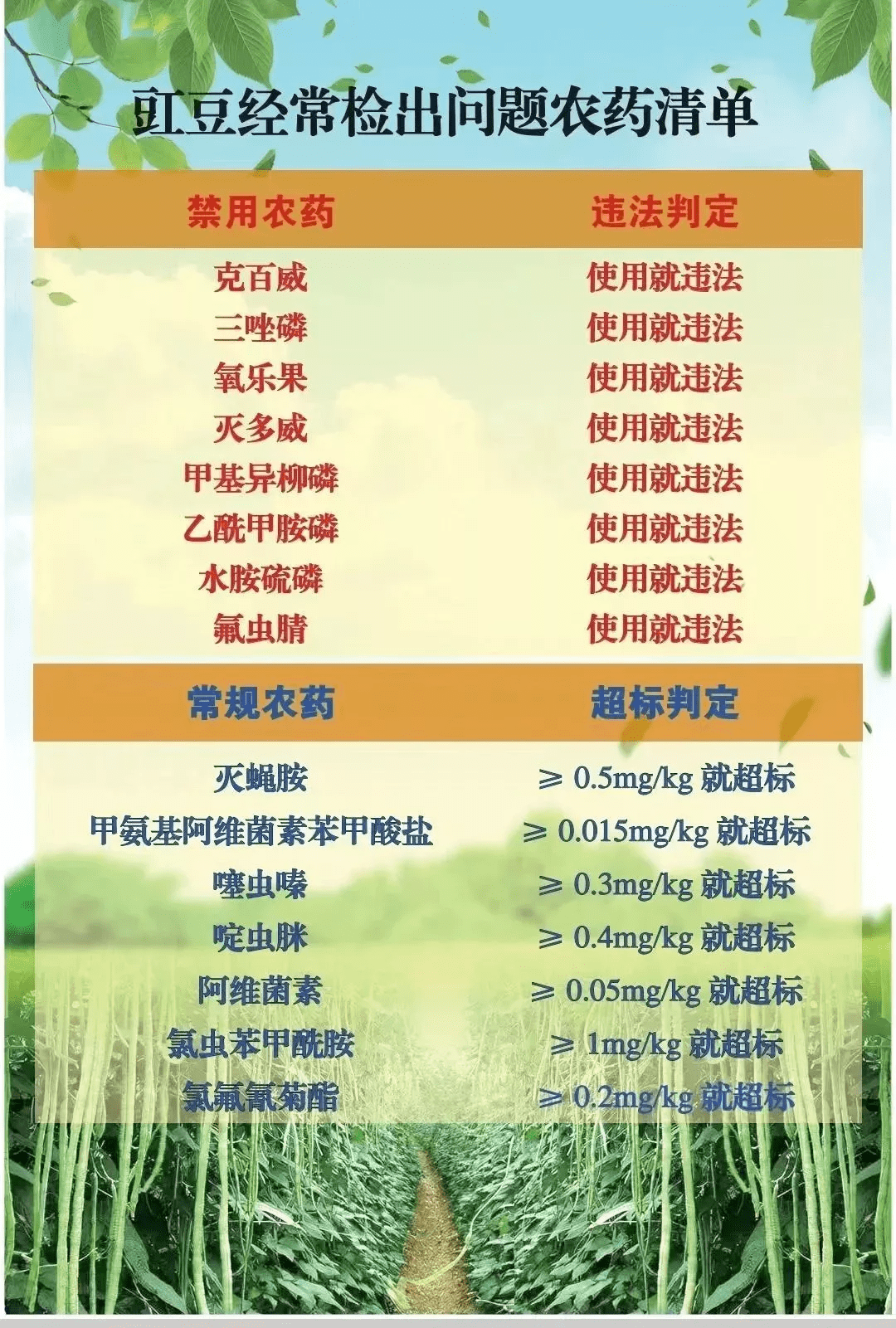 豇豆,別名“長豆角”、“長豆子”、“豆角”。近年來,豇豆由于病蟲害多發(fā)重發(fā)、用藥頻繁,花果同期,采摘間隔短,加之豇豆以小農(nóng)戶分散種值為主,連續(xù)多年監(jiān)測合格率偏低,禁用農(nóng)藥檢出和常規(guī)農(nóng)藥殘留超標(biāo)時(shí)有發(fā)生。為保障“菜籃子”產(chǎn)品質(zhì)量安全,農(nóng)業(yè)農(nóng)村部發(fā)布《食用農(nóng)產(chǎn)品“治違禁 控藥殘 促提升”三年行動(dòng)方案》內(nèi)容中提到,把豇豆列入重點(diǎn)整治品種,在全國開展豇豆農(nóng)藥殘留突出問題攻堅(jiān)治理。 另外,《農(nóng)產(chǎn)品質(zhì)量安全法》規(guī)定,禁止在農(nóng)產(chǎn)品生產(chǎn)經(jīng)營過程中使用國家禁止使用的農(nóng)業(yè)投入品以及其他有毒有害物質(zhì)?!掇r(nóng)藥管理?xiàng)l例》規(guī)定,農(nóng)藥使用應(yīng)按照標(biāo)簽規(guī)定的使用范圍、安全間隔期用藥,不得超范圍用藥。劇毒、高毒農(nóng)藥不得用于防治衛(wèi)生害蟲,不得用于蔬菜、瓜果、茶葉、菌類、中草藥材的生產(chǎn),不得用于水生植物的病蟲害防治。一、農(nóng)產(chǎn)品禁限用農(nóng)藥名錄二、豇豆經(jīng)常檢出問題農(nóng)藥清單