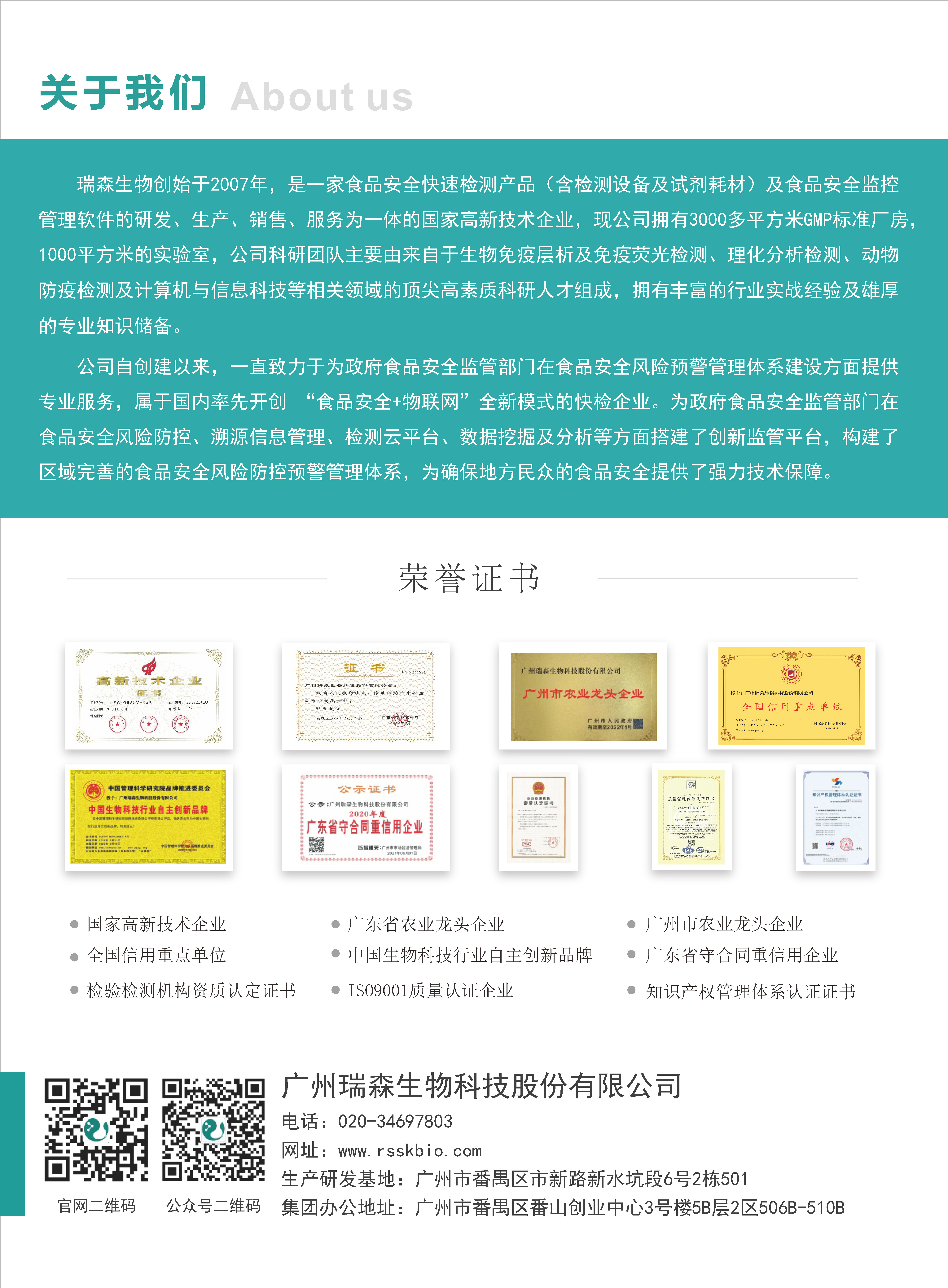 瑞森生物作為廣東省重點(diǎn)農(nóng)業(yè)龍頭企業(yè),一直致力于食品安全檢測行業(yè),至今已深耕十六年之久。公司在食品安全檢測領(lǐng)域發(fā)揮了技術(shù)優(yōu)勢,憑借精湛的技術(shù)為客戶提供優(yōu)質(zhì)、穩(wěn)定、可靠的產(chǎn)品,為國人食品安全保駕護(hù)航,也為推動(dòng)食品檢測行業(yè)高質(zhì)量發(fā)展貢獻(xiàn)了企業(yè)力量。公司屬國家高新技術(shù)企業(yè),廣東省重點(diǎn)農(nóng)業(yè)龍頭企業(yè),廣州市農(nóng)業(yè)龍頭企業(yè),全國重點(diǎn)信用單位,廣東省守合同重信用企業(yè),中國生物科技行業(yè)自主創(chuàng)新品牌企業(yè),目前擁有國家專利29項(xiàng),國家軟件著作權(quán)18項(xiàng),高新技術(shù)產(chǎn)品15項(xiàng),技術(shù)項(xiàng)目研發(fā)5項(xiàng)。公司現(xiàn)擁有快速檢測試劑和設(shè)備上百種,核心產(chǎn)品通過農(nóng)業(yè)農(nóng)村部驗(yàn)證,可為監(jiān)管部門、農(nóng)牧企業(yè)、經(jīng)銷商提供專業(yè)、全面的檢測產(chǎn)品和服務(wù)。