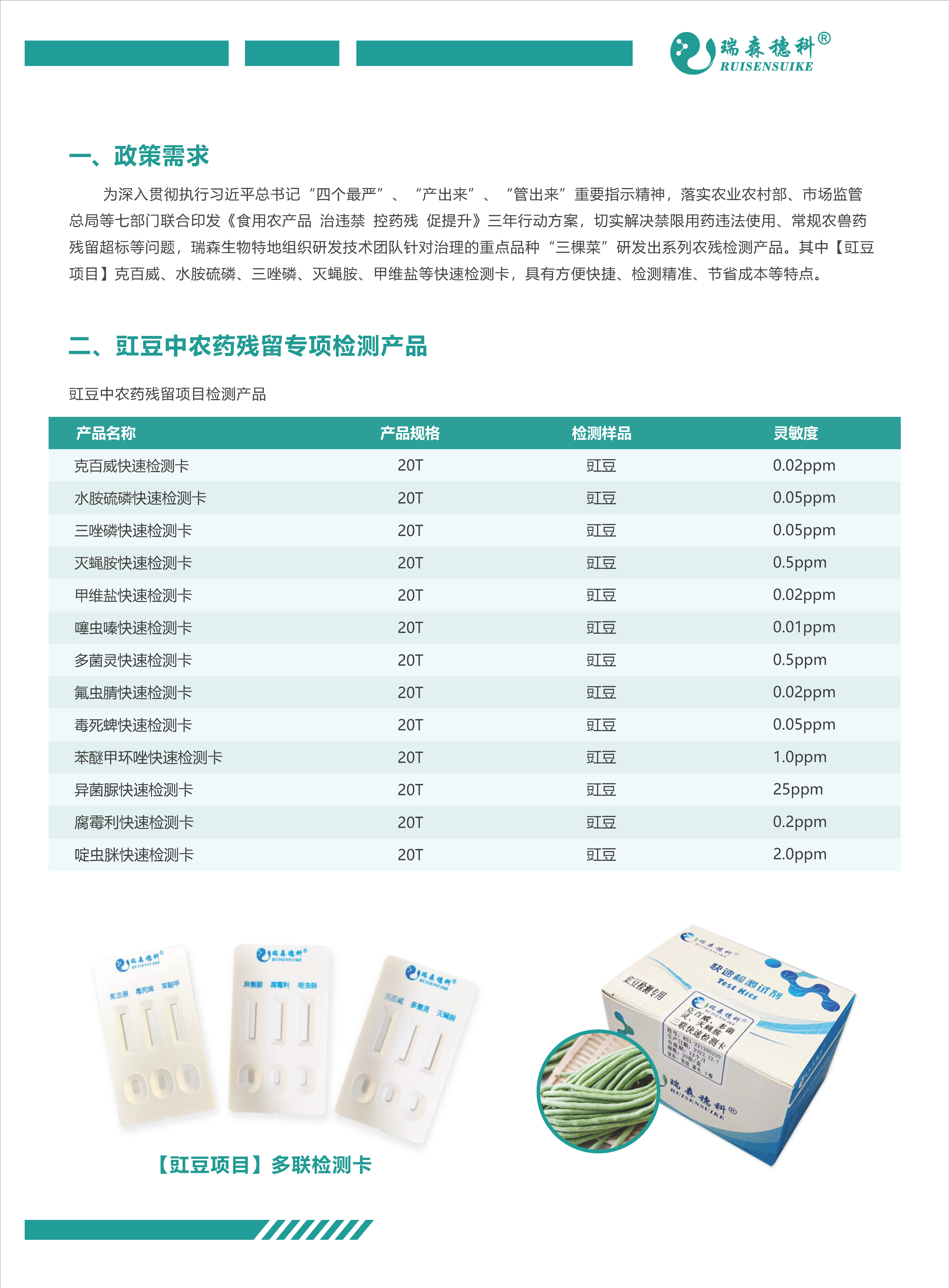 瑞森生物認(rèn)真學(xué)習(xí)和貫徹國家《農(nóng)產(chǎn)品質(zhì)量安全法》,積極擁護(hù)和響應(yīng)農(nóng)業(yè)農(nóng)村部《食用農(nóng)產(chǎn)品“治違禁 控藥殘 促提升”三年行動(dòng)方案》文件精神。針對《方案》中提到的需要重點(diǎn)治理的“豇豆”農(nóng)產(chǎn)品,瑞森生物推出了“豇豆藥殘專項(xiàng)檢測解決方案”,有效解決了豇豆中農(nóng)藥殘留的相關(guān)問題。