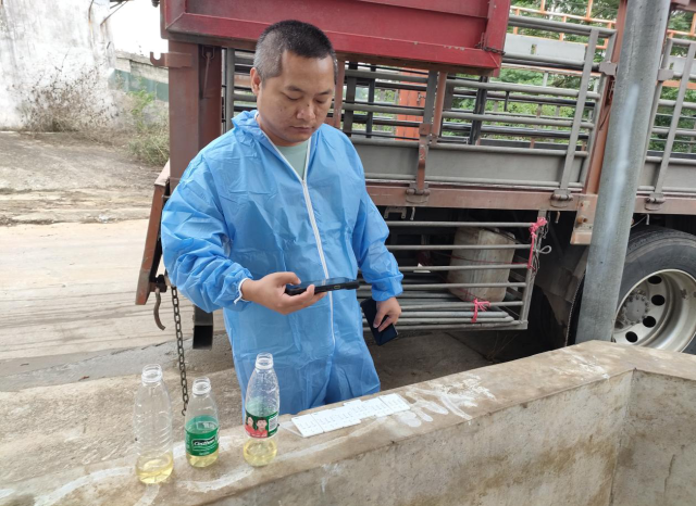 為解決養(yǎng)殖場戶的跑腿問題,湛江市的官方獸醫(yī)接收到檢疫任務后,統(tǒng)一持著定制的移動終端機到養(yǎng)殖場實施現(xiàn)場檢疫。檢疫現(xiàn)場,查看養(yǎng)殖檔案、瘦肉精抽檢、查驗運輸車輛備案情況、查驗生豬的畜禽標識佩戴情況、臨床檢查,一系列檢疫程序,官方獸醫(yī)利用移動終端機一一記錄,并現(xiàn)場拍照取證、錄入畜禽標識編號。檢疫合格后養(yǎng)殖場會收到微信公眾號發(fā)送的6位數(shù)字檢疫證明提取碼。