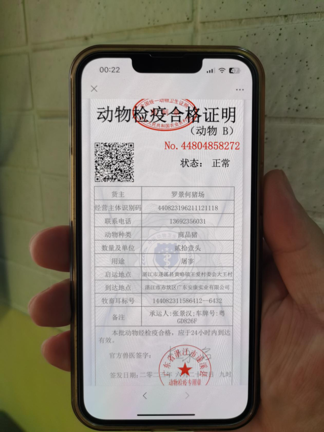 裝車完畢,養(yǎng)殖場不再需要前往鄉(xiāng)鎮(zhèn)的動物檢疫申報點領取紙質(zhì)檢疫證明,憑著提取碼即可獲取檢疫證明電子證照。獸醫(yī)的上門檢疫服務,檢疫證明的無紙化,讓養(yǎng)殖場切切實實感受到了前所未有的便捷?!熬W(wǎng)上申報、網(wǎng)上受理、現(xiàn)場檢疫、電子證照”的檢疫模式,徹底打通服務養(yǎng)殖場戶“最后一公里”。