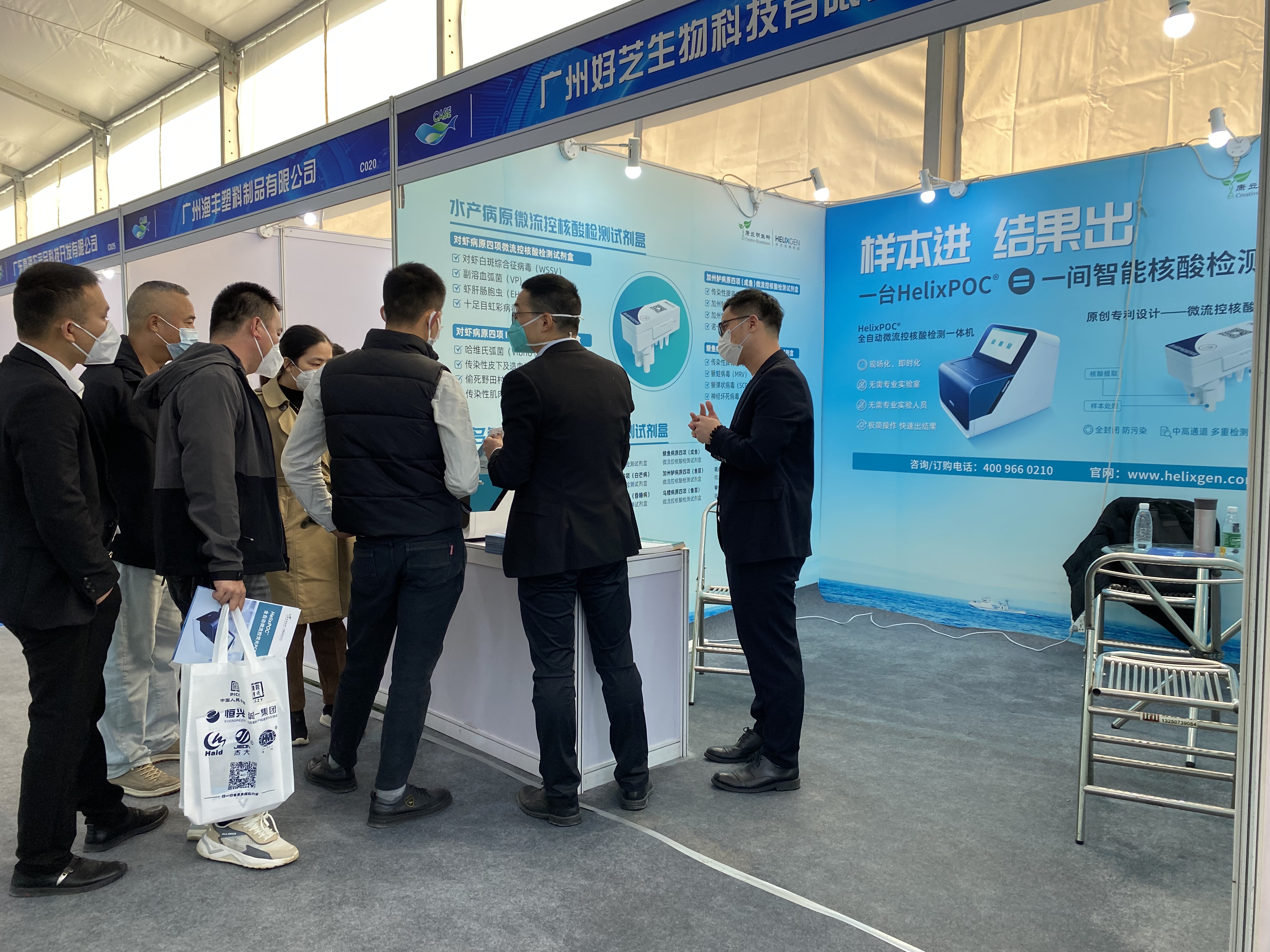 本次展會,康立明生物全資子公司好芝生物攜帶HelixPOC®全自動微流控?zé)晒?/span>PCR一體機及HelixPOC®水產(chǎn)病原微流控核酸檢測試劑盒赴展。