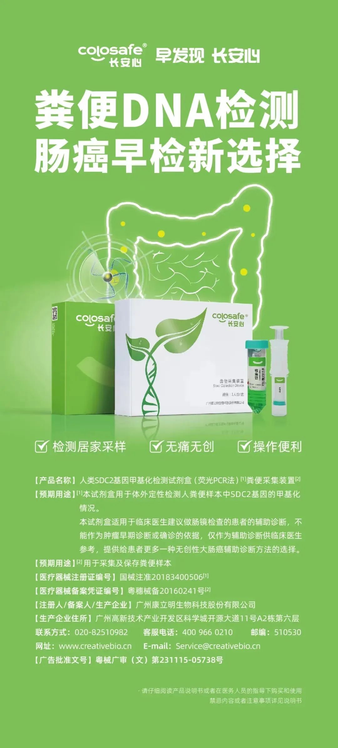 長安心®人類SDC2基因甲基化檢測試劑盒(熒光PCR法)于2018年11月20日獲國家藥監(jiān)局頒發(fā)的三類醫(yī)療器械注冊證書,是中國率先獲批上市的腸癌糞便基因檢測試劑盒,成為國內(nèi)腸癌無創(chuàng)DNA檢測破冰之作。長安心®糞便基因檢測通過解讀糞便中脫落腫瘤細(xì)胞的基因異常改變,幫助醫(yī)生發(fā)現(xiàn)患者早期腸癌病變情況,有希望將結(jié)直腸癌阻斷在早期階段,從而達(dá)到預(yù)防和根治結(jié)直腸癌的目的。