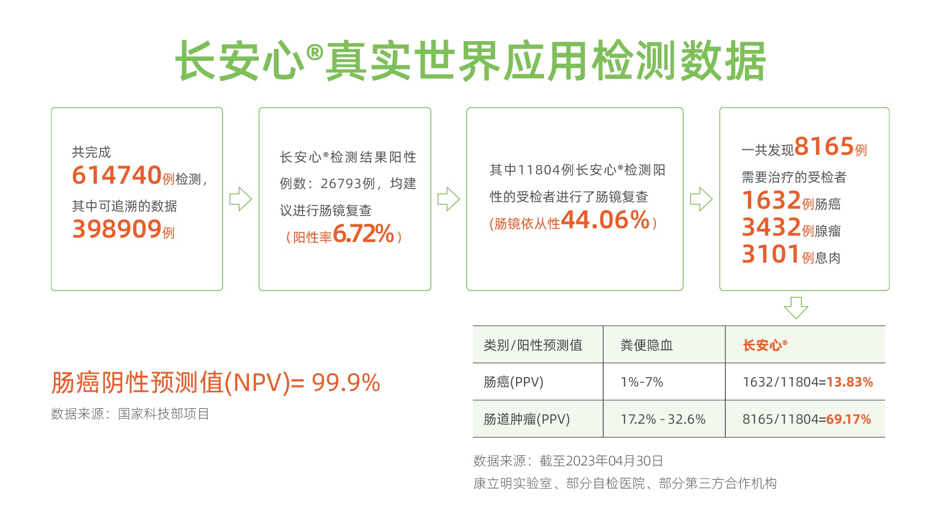 在“人類健康,我之使命”崇高理想下,發(fā)揚康立明生物的社會責任與擔當精神,以長安心®等腫瘤早篩產(chǎn)品的優(yōu)越性能,引領行業(yè)的技術標準,創(chuàng)新的公共衛(wèi)生篩查模式,加大人群的參與度來實現(xiàn)腫瘤的早診早治。來自康立明醫(yī)學檢驗實驗室、部分自檢醫(yī)院、部分第三方合作機構的數(shù)據(jù)顯示:截至2023年4月30日,長安心®共完成614740例檢測,其中可追溯數(shù)據(jù)398909例。長安心®檢測結果陽性數(shù)26793例(陽性率6.72%),均建議進行腸鏡復查,其中11804例長安心®檢測陽性受檢者進行了腸鏡復查(腸鏡依從性44.06%)。